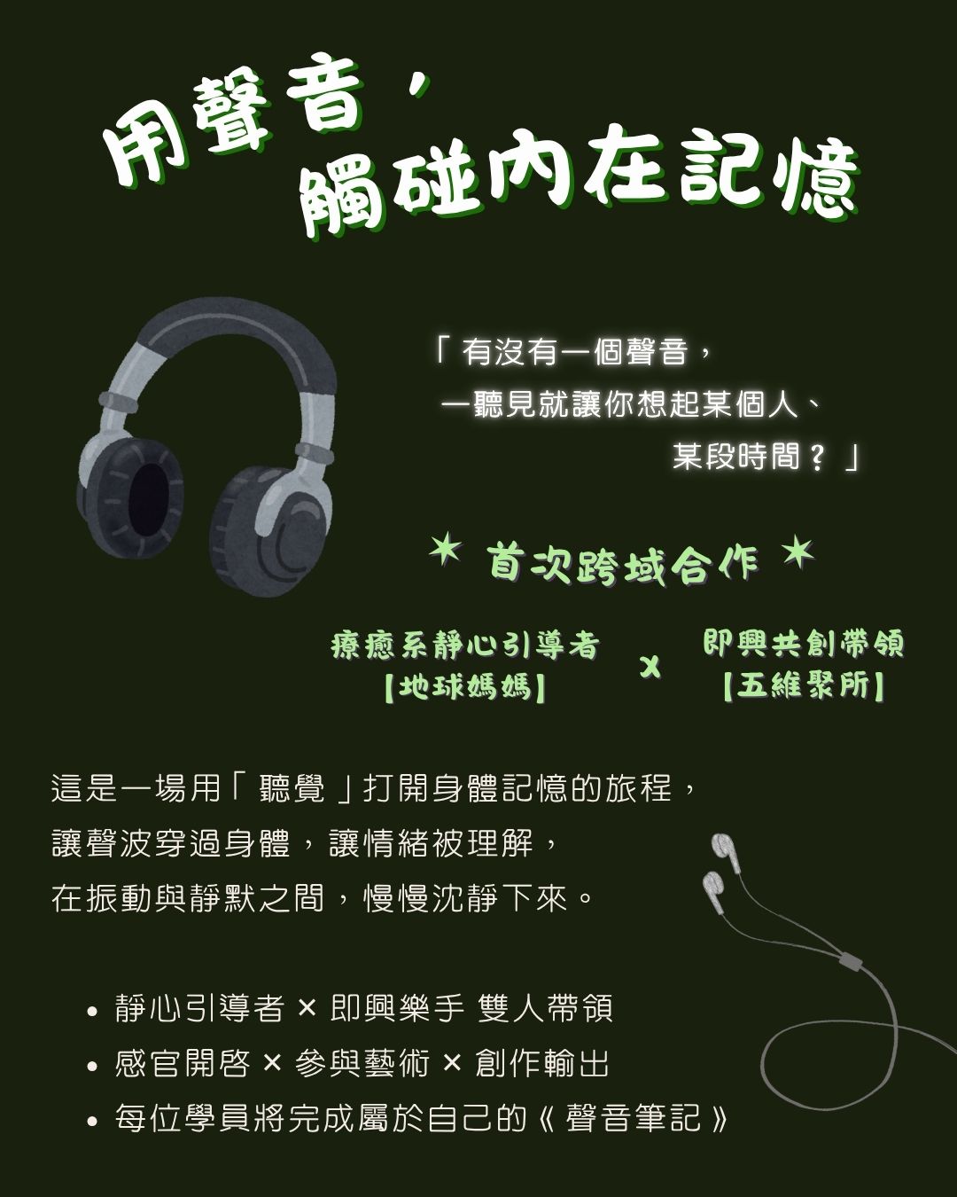 是一系列由五維聚所與地球媽媽共同設計的感官探索活動,邀請你用眼、耳、鼻、舌、心重新感受世界,並透過創作,與自己展開一次真正的對話